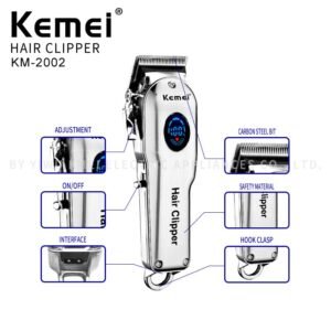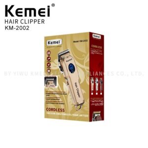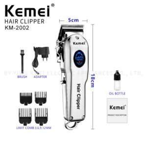 As máquinas Kemei são muito conhecidas pela ótima precisão em seus cortes e praticidade em seu design fazendo com que seja muito utilizada por profissionais. O modelo 2002 além de conter display em LCD, foi desenvolvida para o uso sem fio e também conta com um design antiderrapante para maior segurança. Possui um motor potente que corta os pelos com maior eficiência, sem machucar a pele, sendo ideal para uso profissional e/ou doméstico.